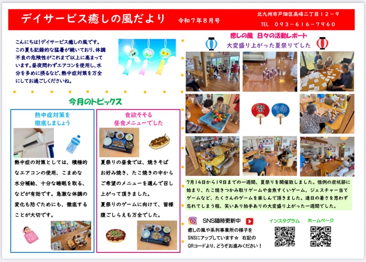 2025年8月7日 / 最終更新日時 : 2025年8月7日 株式会社クラーレ News 「デイサービス癒しの風だより」令和7年8月号です。 こんにちは!!デイサービス癒しの風です。「デイサービス癒しの風だより」令和7年8月号が発行されました。 ぜひご覧ください。
