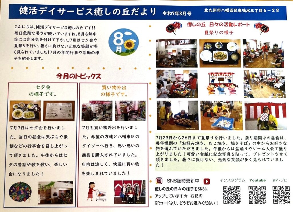 2025年8月7日 / 最終更新日時 : 2025年8月7日 株式会社クラーレ News 「健活デイサービス癒しの丘だより」令和7年8月号です。 こんにちは!!健活デイサービス癒しの丘です。 健活デイサービス癒しの丘「健活デイサービス癒しの丘だより」令和7年8月号が発行されました。 ぜひご覧ください。