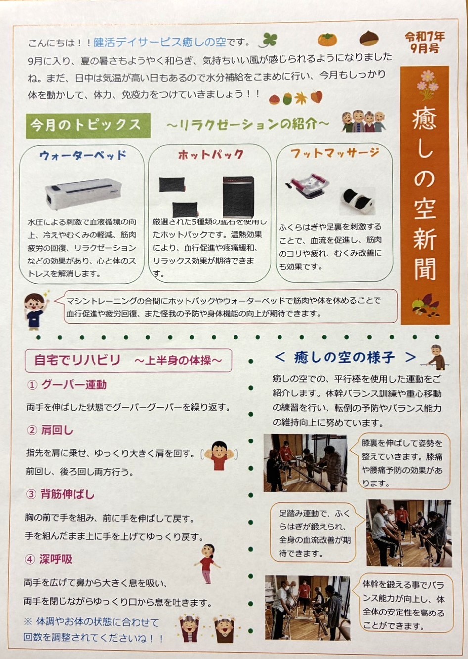 2025年9月15日 / 最終更新日時 : 2025年10月15日 株式会社クラーレ News 「癒しの空新聞」令和7年9月号です。 こんにちは!!健活デイサービス癒しの空です。 健活デイサービス癒しの空の「癒しの空新聞」令和7年9月号が発行されました。 ぜひご覧ください!!