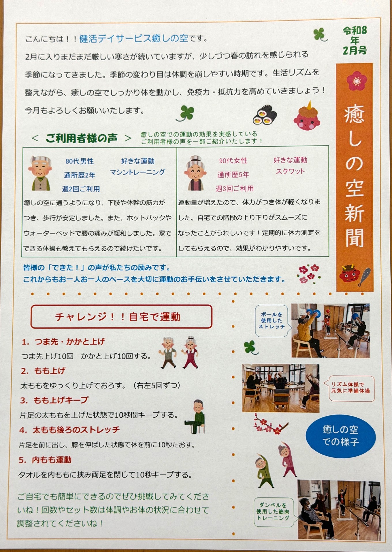 2026年2月9日 / 最終更新日時 : 2026年2月9日 株式会社クラーレ News 「癒しの空新聞」令和8年2月号です。 こんにちは!!健活デイサービス癒しの空です。 健活デイサービス癒しの空の「癒しの空新聞」令和8年2月号が発行されました。 ぜひご覧ください!!